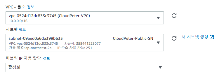 VPC: 생성한 VPC 선택 (CloudPeter-VPC) 서브넷: 생성한 Subnet 선택 (CloudPeter-Public-SN) 퍼플릭 IP 자동 할당: 활성화