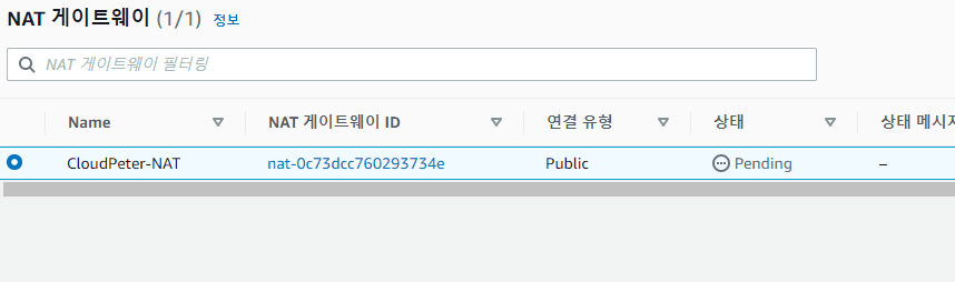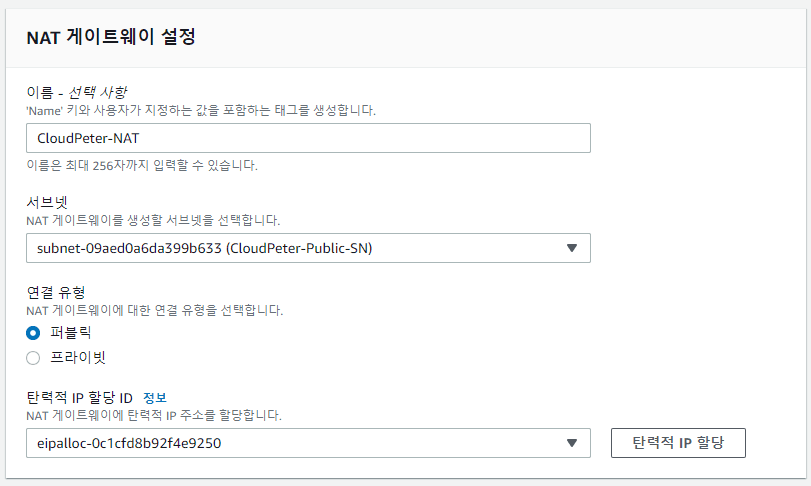 이름: CloudPeter-NAT 서브넷: 퍼플릭 서브넷 선택 (CloudPeter-Public-SN) 탄력적 IP 할당 클릭!