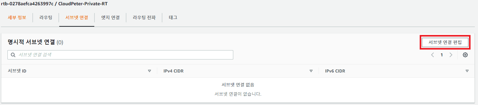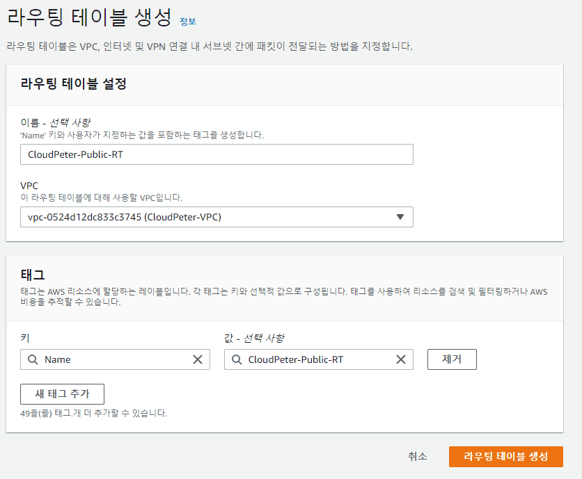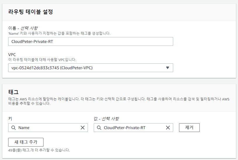 이름 태그: CloudPeter-Private-RT VPC: 생성한 VPC 선택 (CloudPeter-VPC)