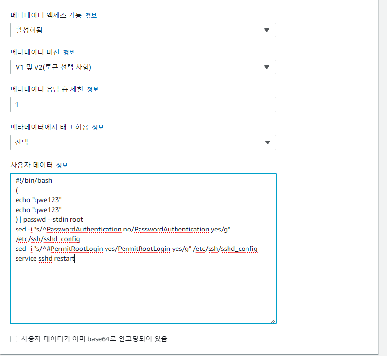 service sshd restart위에 사용자 데이터는 암호 방식으로 ssh에 접근할 수 있게 하는 설정이다. EC2 인스턴스가 부팅될 때 읽어서 적용한다.