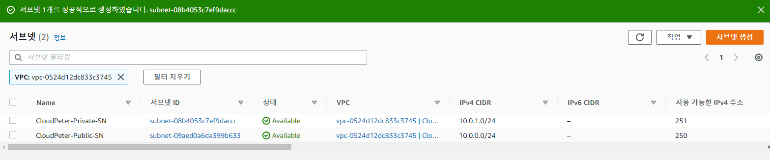 서브넷 생성 VPC ID: 생성한 VPC 선택 (CloudPeter-VPC) 이름 태그: CloudPeter-Private-SN 가용 영역 설정: ap-northeast-2c IPv4 CIDR 블록: 10.0.1.0/24