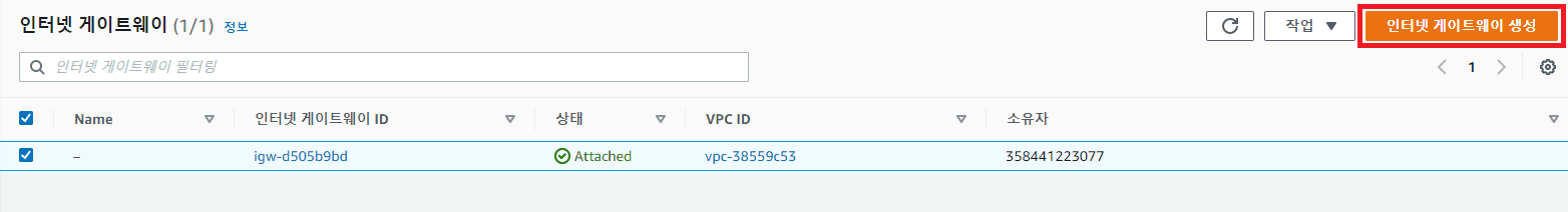 - VPC Console 접속 -> 인터넷 게이트웨이