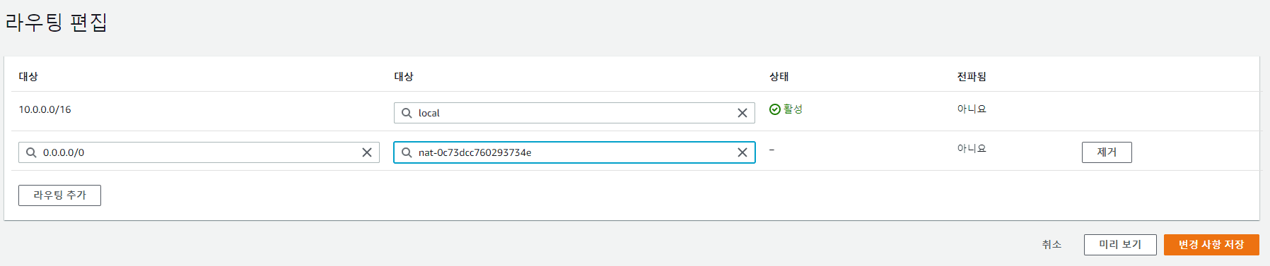 | 프라이빗 라우팅 테이블 경로 추가 |
